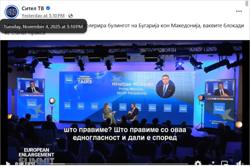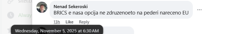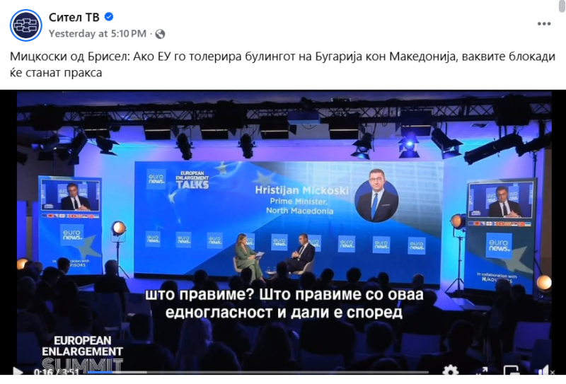 На ден 04.11.2025 година, националната телевизија „Сител“, на својот фејсбук профил „Сител ТВ“, објави видео од изјава на премиерот Христијан Мицоски, од неговата посета во Брисел. Во прилог на објавеното видео, е напишано: „ Мицкоски од Брисел: Ако ЕУ го толерира булингот на Бугарија кон Македонија, ваквите блокади ќе станат пракса“. Во коментар, под објавата, корисникот „Nenad Sekeroski“ коментира: „БРИКС е наша опција не здружението на педери наречено ЕУ“. Со ваквиот коментар, корисникот користи говор на омраза насочен кон припадниците на геј заедницата.