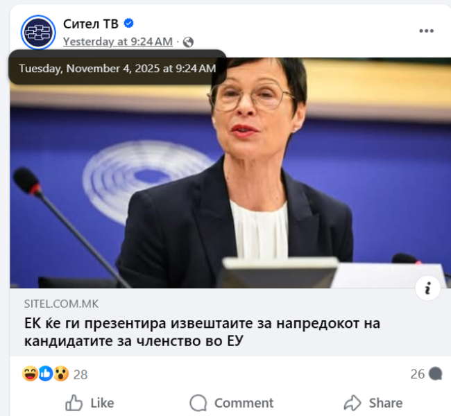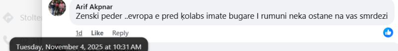 На ден 04.11.2025 година, националната телевизија „Сител“, на својата веб страна, објави вест насловена како: „ЕК ќе ги презентира извештаите за напредокот на кандидатите за членство во ЕУ’ Истата вест ја објави и на својот фејсбук профил „Сител ТВ“. Во коментар, под објавата, корисникот „Arif Akpnar“ коментира: „Женски педер... европа е пред колапс имате бугари и румуни нека остане на вас смрдежи“. Корисникот „Saso Bogdanovski“ напиша: „Сега уште еден услов за влез во ЕУ. МОРА ПРЕМИЕРОТ ДА БИДЕ ОБРАТЕН (педер).“ И двајцата корисници користат говор на омраза насочен кон припадниците на геј заедницата.