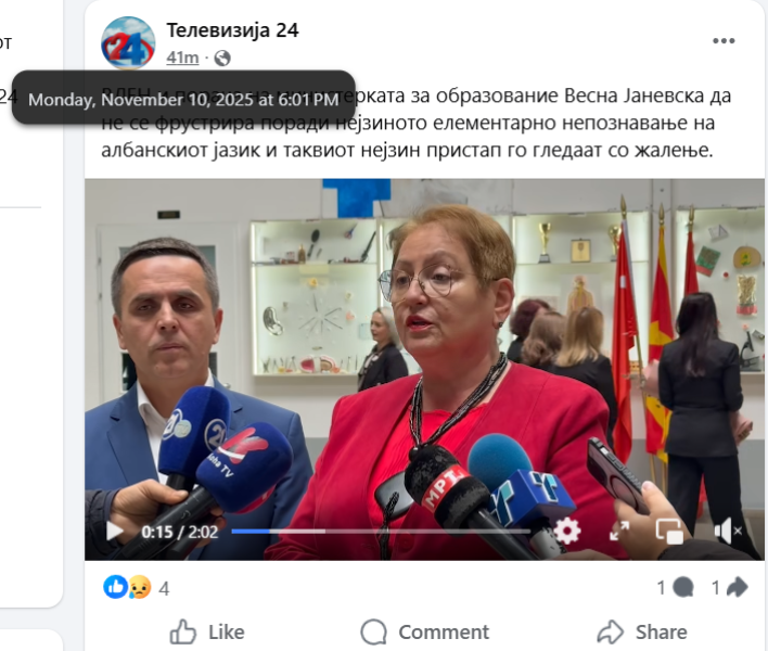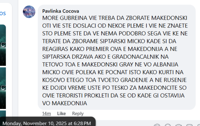 На ден 10.11.2025 година, националната телевизија „Телевизија 24“, на својот фејсбук профил „Телевизија 24“ објави видео од изјави на градоначалникот на Тетово, Биљал Касами и министерката за образование, Весна Јаневска. Во прилог на објавеното видео е напишано: „ВЛЕН и порача на министерката за образование Весна Јаневска да не се фрустрира поради нејзиното елементарно непознавање на албанскиот јазик и таквиот нејзин пристап го гледаат со жалење.“ Во коментар, под објавата, корисникот „Pavlinka Cocova“ коментира: „МОРЕ ЃУБРИЊА ВИЕ ТРЕБА ДА ЗБОРАТЕ МАКЕДОНСКИ ОТИ ВИЕ СТЕ ДОШЉАЦИ ОД НЕКОЕ ПЛЕМЕ И ВИЕ НЕ ЗНАЕТЕ ШТО ПЛЕМЕ СТЕ ДА ВЕ НЕМА ПОДОБРО СЕГА ВИЕ ЌЕ НЕ ТЕРАТЕ ДА ЗБОРАМЕ ШИПТАРСКИ МИЦКО КАДЕ СИ ДА РЕАГИРАШ КАКО ПРЕМИЕР ОВА Е МАКЕДОНИЈА А НЕ ШИПТАРСКА ДРЖАВА АКО Е ГРАДОНАЧАЛНИК НА ТЕТОВО ТОА Е МАКЕДОНСКИ ГРАД НЕ ВО АЛБАНИЈА МИЦКО ОВИЕ ПОЛЕКА ЌЕ ПОЧНАТ ИСТО КАКО КУРТИ НА КОСОВО ЕТЕГО ТОА ТВОЕТО ГРАДЕЊЕ А НЕ РУШЕЊЕ ЌЕ ДОЈДИ ВРЕМЕ УШТЕ ПО ТЕШКО ЗА МАКЕДОНЦИТЕ СО ОВИЕ ТЕРОРИСТИ ПРОКЛЕТИ ДА СЕ ОД КАДЕ ГИ ОСТАВИЈА ВО МАКЕДОНИЈА.“ Со вкавиот коментар, корисникот користи говор на омраза насочен кон албанското население.