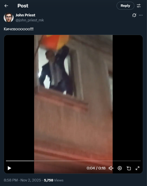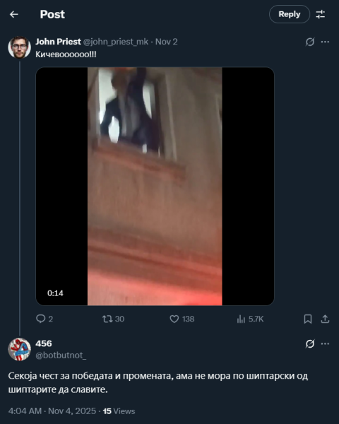 На ден 02.11.2025 година, Х профилот „@john_priest_mk“, на својот Х профил, објави видео од прослава на победата на кандидатот за градоначалник од редовите на ВМРО – ДПМНЕ, во Кичево, на претстојните избори за градоначалник. На ден 04.11.2025 година, во коментар под објавата, Х корисникот „@botbutnot_“ коментира: „Секоја чест за победата и промената, ама не мора по шиптарски од шиптарите да славите.“ Со ваквиот коментар, корисникот користи говор на омраза насочен кон албанското население.