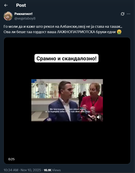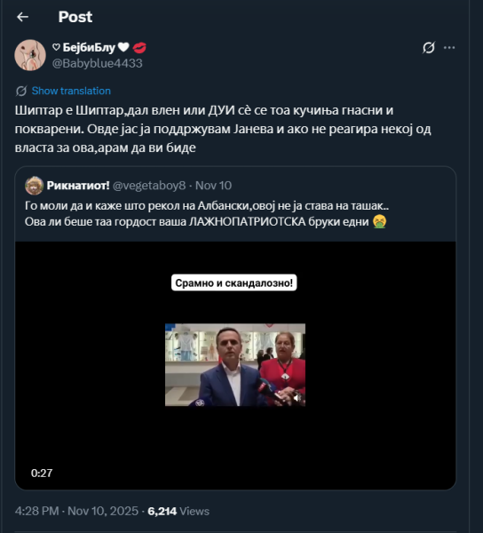 На ден 10.11.2025 година, Х корисникот „@vegetaboy8“, на својот Х профил, објави видео од изјави на градоначалникот на Тетово, Биљал Касами и министерката за образование, Весна Јаневска. Во прилог на објавеното видео, напиша: „ Го моли да и каже што рекол на Албански,овој не ја става на ташак.. Ова ли беше таа гордост ваша ЛАЖНОПАТРИОТСКА бруки едни“. Х корисникот „ @Babyblue4433“ ја реобјави оваа објава, на својот Х профил, а во прилог на истата, напиша: „ Шиптар е Шиптар,дал влен или ДУИ сѐ се тоа кучиња гнасни и покварени. Овде јас ја поддржувам Јанева и ако не реагира некој од власта за ова,арам да ви биде“ Со ваквата објава, корисникот користи говор на омраза насочен кон албанското население.