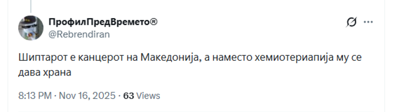 На ден 16.11.2025 година, во 20:13 часот, објавен е говор на омраза врз основа на етничка припадност од X профилот @Rebrendiran. Во твитот пишува „Шиптарот е канцерот на Македонија, а наместо хемиотериапија му се дава храна“.