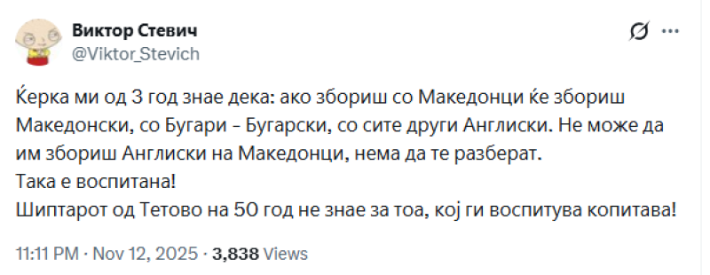 На ден 12.11.2025 година, во 23:11 часот, објавен е говор на омраза врз основа на етничка припадност од Х профилот @Viktor_Stevich. Во пост пишува „ Ќерка ми од 3 год знае дека: ако збориш со Македонци ќе збориш Македонски, со Бугари - Бугарски, со сите други Англиски. Не може да им збориш Англиски на Македонци, нема да те разберат. Така е воспитана! Шиптарот од Тетово на 50 год не знае за тоа, кој ги воспитува копитава!“