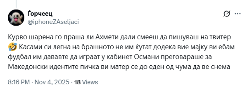 На ден 04.11.2025 година, во 20:16 часот, објавен е говор на омраза врз основа на политичка припадност напишан од Х профилот @iphoneZAseljaci. Во коментар пишува „Курво шарена го праша ли Ахмети дали смееш да пишуваш на твитер Касами си легна на брашното не им ќутат додека вие мајку ви ебам фудбал им дававте да играат у кабинет Османи преговараше за Македонски идентите пичка ви матер се до еден од чума да ве снема “.