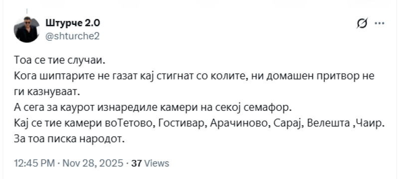На ден 28.11.2025 година, во 12:45 часот, регистриран е говор на омраза поради етничка припадност од Х профилот @shturche2. Во коментар пишува „ Тоа се тие случаи. Кога шиптарите не газат кај стигнат со колите, ни домашен притвор не ги казнуваат. А сега за каурот изнаредиле камери на секој семафор. Кај се тие камери воТетово, Гостивар, Арачиново, Сарај, Велешта ,Чаир. За тоа писка народот“.