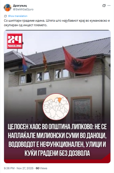 На ден 27.11.2025 година, во 21:36 часот е објавен говор на омраза врз основа на етничка припадност од Х профилот @SieMiGaDjuro. Во постот пишува „Со шиптари градиме идина. Штета што најубавиот крај во кумановско е окупиран од инцест племето“.