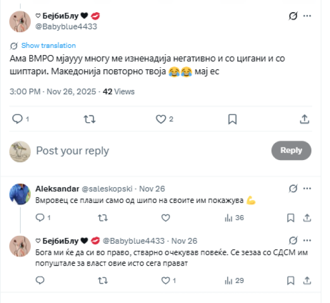 На ден 26.11.2025 година, во 15:00 часот е нотиран е говор на омраза врз основа на етничка припадност и социјално потекло, од Х профилот @Babyblue4433. Во текст пишува „ Ама ВМРО мјаууу многу ме изненадија негативно и со цигани и со шиптари. Македонија повторно твоја мај ес“.
