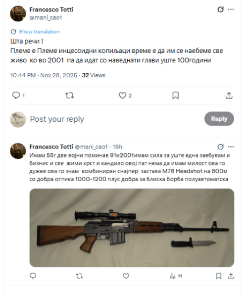 На ден 28.11.2025 година, во 22:44 часот, објавен е говор на омраза врз основа на етничка припадност од Х профилот @mani_cao1. Во коментар пишува „ Шта речи ! Племе е Племе инцесоидни копиљаци време е да им се наебеме све живо ко во 2001 па да идат со наведнати глави уште 100години“.