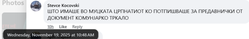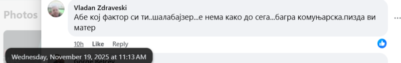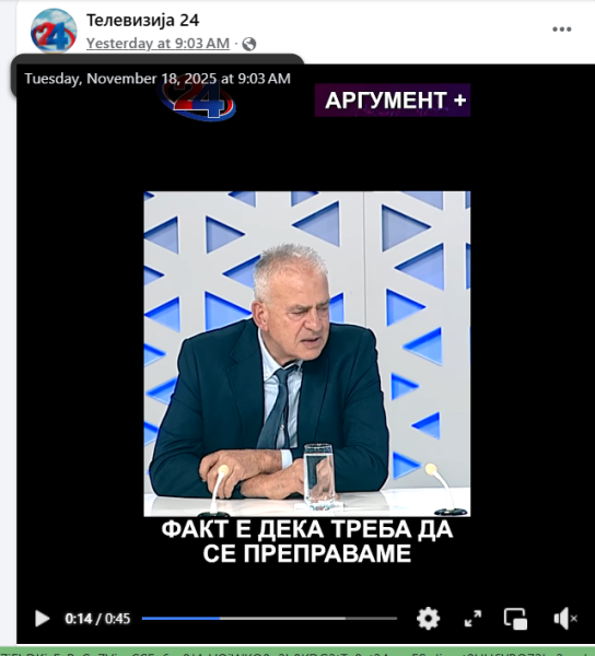 На ден 18.11.2025 година, националната телевизија „Телевизија 24“, на својот фејсбук профил „Телевизија 24“, објави видео од гостување на поранешниот амбасадор на РСМ во НАТО, Нано Ружин, во дебатана емисија која е дел од нивната програма на емитување. Во коментар под објавата, фејсбук корисникот „Sveto Risteski“ коментира: „Па стоко сдсмовска свесни ли сте каква штета на Македонија направивте за 7 год владеење...СИТЕ ВИЕ ИЗГЛАНЦАНИ КОПУЦИ ИЗВРШИВТЕ ВЕЛЕПРЕДАВСТВО НА МАКЕДОНИЈА И МАКЕДОНСКИОТ НАРОД И ЗА ТОА ТРЕБА ДА БИДЕТЕ РИГОРОЗНО КАЗНЕТИ!!!“. Корисникот „Stevce Kocovski“ напиша: „ШТО ИМАШЕ ВО МУЦКАТА ЦРПНАТИОТ КО ПОТПИШВАШЕ ЗА ПРЕДАВНИЧКИОТ ДОКУМЕНТ КОМУЊАРСКО ТРКАЛО“. Корисникот „Vladan Zdraveski“ коментира: „Абе кој фактор си ти..шалабајзер...е нема како до сега...багра комуњарска пиздра ви матер“. Корисникот „Vanco MItreski“ коментира: „Од вас копитарите северни се сите овие проблеми“. Сите корисници користат говор на омраза насочен кон членовите и симпатизерите на политичката партија „СДСМ“, како и кон сите оние кои гласаа за промена на името на Референдумот во 2018 година.