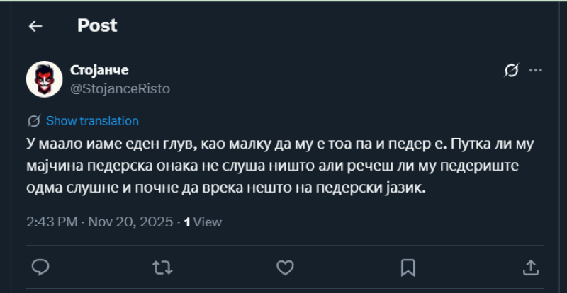 На ден 20.11.2025 година, Х корисникот „@StojanceRisto“, на својот Х профил, напиша: „У маало иаме еден глув, као малку да му е тоа па и педер е. Путка ли му мајчина педерска онака не слуша ништо али речеш ли му педериште одма слушне и почне да врека нешто на педерски јазик.“ Со ваквата објава, корисникот користи говор на омраза насочен кон припадниците на геј заедницата.