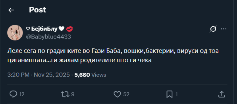 На ден 25.11.2025 година, Х корисникот „@Babyblue4433“, на својот Х профил, напиша: „Леле сега по градинките во Гази Баба, вошки,бактерии, вируси од тоа цигаништата...ги жалам родителите што ги чека“. Со ваквиот коментар, корисникот користи говор на омраза насочен кон припадниците на ромската етничка заедница.