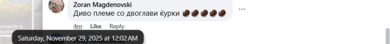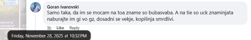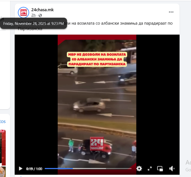 На ден 28.11.2025 година, онлајн медиумот „24 часа“, на својот фејсбук профил „24chasa.mk“ објави видео од возила со развеани албански знамиња во колона на една од улиците во градот Скопје. Во прилог на објавеното видео, напиша:„ МВР не дозволи на возилата со албански знамиња да парадираат по Партизанска“. Во коментар, под објавата, корисникот “Zoran Magdenovski“ напиша: „Диво племе со двоглави ќурки“. Корисникот „Goran Ivanovski“ коментира: „Само така, да им се мочам на тоа знаме со бубашваба. А на тие со УЧК знамињата набутајте им ги во г`з, досадни се веќе, копилиња смрдливи.“. Корисникот „Zoran Sumaievski“ коментира: „Гнасотија шиптарска племето да ви се сотре аир да не видете“. Сите корисници користат говор на омраза насочен кон албанското население.