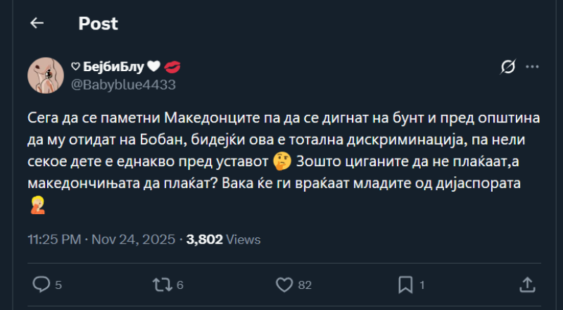 На ден 24.11.2025 година, Х корисникот „@Babyblue4433“, на својот Х профил, напиша: „Сега да се паметни Македонците па да се дигнат на бунт и пред општина да му отидат на Бобан, бидејќи ова е тотална дискриминација, па нели секое дете е еднакво пред уставот. Зошто циганите да не плаќаат, а македончињата да плаќат? Вака ќе ги враќаат младите од дијаспората“. Со ваквата објава, корисникот користи говор на омраза насочен кон припадниците на ромската етничка заедница.