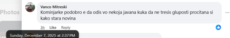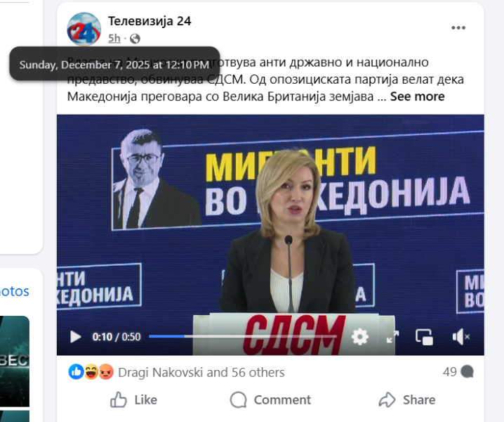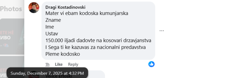 На ден 07.12.2025 година, националната телевизија „Телевизија 24“, на својот фејсбук профил „Телевизија 24“, објави видео од изјава од прес конференција на портпаролката на СДСМ - Богданка Кузеска. Во прилог на видеото е напишано: „Власта на Мицкоски подготвува анти државно и национално предавство, обвинуваа СДСМ. Од опозициската партија велат дека Македонија преговара со Велика Британија земјава да стане базна дестинација за враќање мигранти...“. Во коментар под објавата, фејсбук корисникот „Dragi Kostadinovski“ коментира: „Матер ви ебам кодошка комуњарска, Знаме, Име, Устав, 150.000 дадовте на косовари државјанства и сега ти ќе кажуваш за национални предавства, племе кодошко.“. Корисникот „Vanco Mitreski“ напиша: „Комунарќе подобро е да одиш во некоја јавна куќа да не тресис глупости прочитана си како стара новина“. И двајцата корисници користат говор на омраза насочен кон членовите и симпатизерите на политичката партија „СДСМ“.
