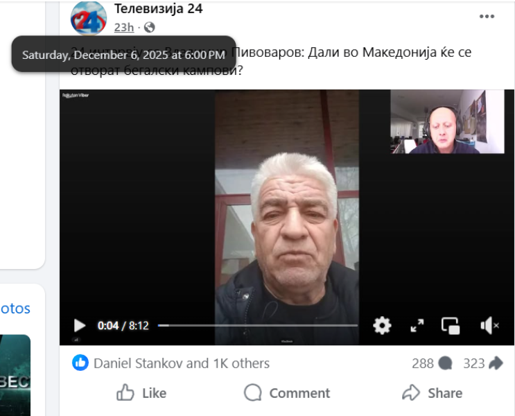 На ден 06.12.2025 година, националната телевизија „Телевизија 24“, на својот фејсбук профил „Телевизија 24“, објави видео насловено како: „24 интервју со Владимир Пивоваров: Дали во Македонија ќе се отворат бегалски кампови?“. Во коментар под објавата, корисникот „Stefan Dimitrov“ коментира: „Празноглавите комуњари се само северџани и точка“. Корисникот „Костадин Тасевски“ напиша: „Од каде бе ретардо ти знаеш што пишува и што договориле? Ајде да го видиме... племе ви ебам ретардирано комуњарско...“. И двајцата кроисници користат говор на омраза насочен кон членовите и симпатизерите на политичката партија „СДСМ“, како и кон оние кои гласаа за промена на уставното име на државата на Референдумот во 2018 година.