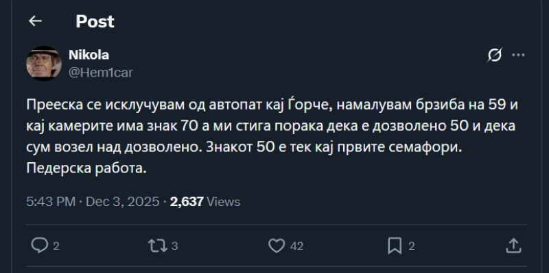 На ден 03.12.2025 година, Х корисникот „@Hem1car“, на својот Х профил, напиша: „Прееска се исклучувам од автопат кај Ѓорче, намалувам брзиба на 59 и кај камерите има знак 70 а ми стига порака дека е дозволено 50 и дека сум возел над дозволено. Знакот 50 е тек кај првите семафори. Педерска работа.“. Со ваквата објава, корисникот користи говор на омраза насочен кон припадниците на геј заедницата.