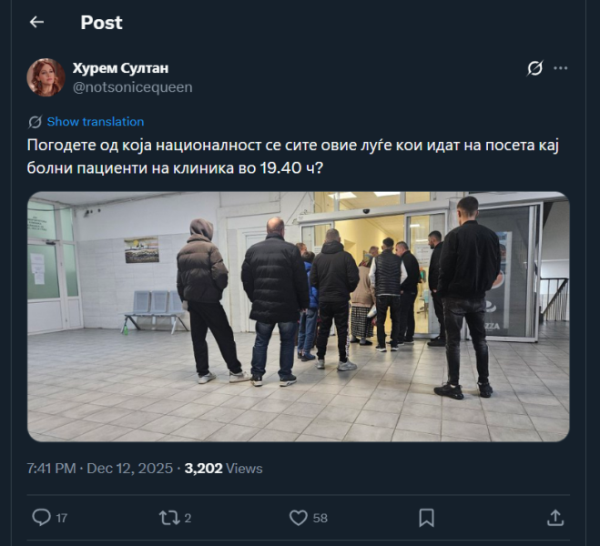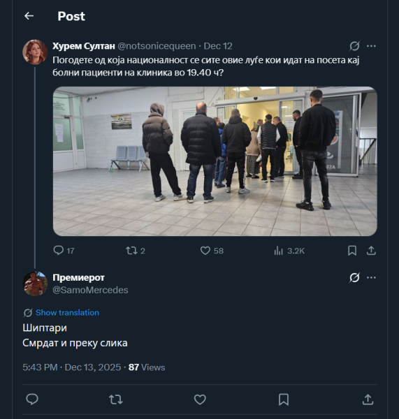 На ден 12.12.2025 година, Х корисникот „@notsonicequeen“, на својот профил објави слика од луѓе во чекална од одредена болница, а во прилог на сликата, напиша: „Погодете од која националност се сите овие луѓе кои идат на посета кај болни пациенти на клиника во 19.40 ч?“. Во коментар, под објавата, корисникот „@SamoMercedes“ коментира: „Шиптари Смрдат и преку слика“. Корисникот користи говор на омраза насочен кон албанското население.