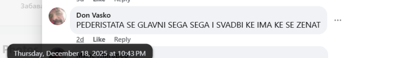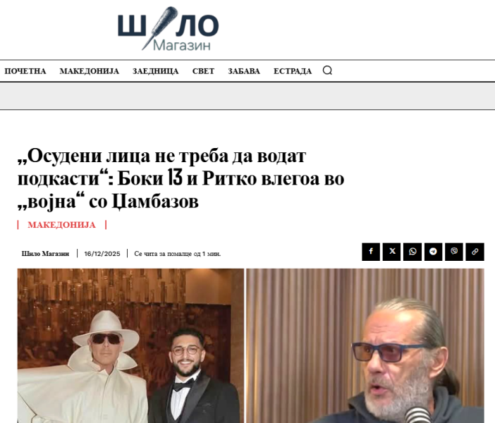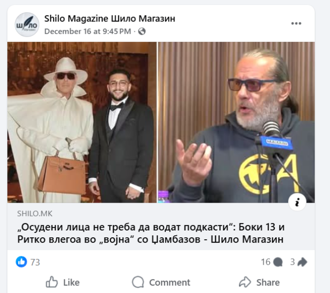 На ден 16.12.2025 година, електронскиот медиум „Шило Магазин“, на својата веб страна објави вест насловена како: „Осудени лица не треба да водат подкасти: Боки 13 и Ритко влегоа во „војна“ со Игор Џамбазов“. Истата вест ја објави и на својот фејсбук профил „Shilo Magazine Шило Магазин“. Во коментар, под објавата, фејсбук корисникот „Jovica Spasovski“ коментира: „ И терористи не треба да ни ја водат државата... ама главни се... жално е... педерска работа“. Корисникот „Don Vasko“ напиша: „ПЕДЕРИШТАТА СЕГА СЕГА И СВАДБИ ЌЕ ИМА ЌЕ СЕ ЖЕНАТ“. Корисникот „Dragan Rapeshoski“ коментира: „ТОЧНО ОСУДЕНИ ПА ПЛУС И ДВАЈЦАТА ПЕДЕРИ ЕДЕН ЃУПСКИ И МАКЕДОНСКИ НАЈГОЛЕМ ПУФТЕР“. Во дел од коментарите се забележува говор на омраза насочен кон припадниците на геј заедницата, а во дел и кон припадниците на ромската етничка заедница.