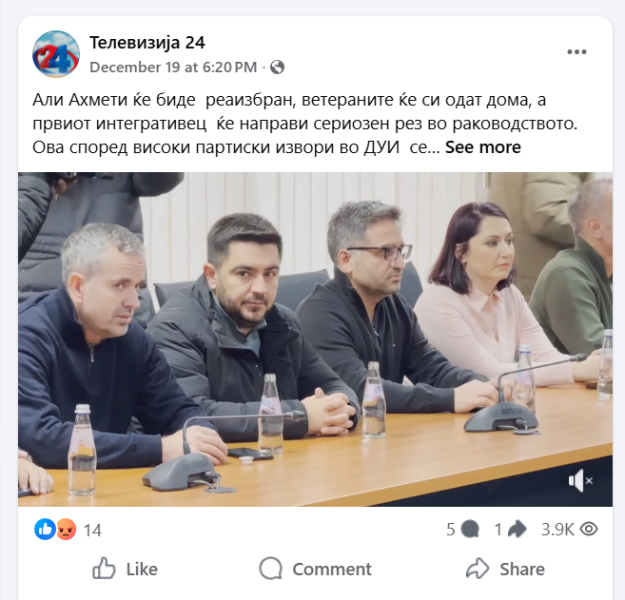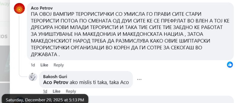 На ден 19.12.2025 година, националната телевизија „Телевизија 24“, на својот фејсбук профил „Телевизија 24“, објави видео – репортажа, а во прилог на истата, напиша: „Али Ахмети ќе бидe реаизбран, ветераните ќе си одат дома, а првиот интегративец ќе направи сериозен рез во раководството. Ова според високи партиски извори во ДУИ се очекува да биде епилогот до утрешниот конгрес на ДУИ по изборниот пораз на локланиѕе избори каде не освоија ниеден албански бастион.“. Во коментар, под објавата, фејсбук корисникот „Aco Petrov“ коментира: „ПА ОВОЈ ВАМПИР ТЕРОРИСТИЧКИ СО УМИСЛА ГО ПРАВИ СИТЕ СТАРИ ТЕРОРИСТИ ПОТОА ПО СМЕНАТА ОД ДУИ СИТЕ КЕ СЕ ПРЕФРЛАТ ВО ВЛЕН А ТОЈ КЕ ДРЕСИРА НОВИ МЛАДИ ТЕРОРИСТИ И ТАКА ТИЕ СИТЕ ТИЕ ЗАЕДНО КЕ РАБОТАТ ЗА УНИШТУВАЊЕ НА МАКЕДОНИЈА И МАКЕДОНСКАТА НАЦИЈА , ЗАТОА МАКЕДОНСКИОТ НАРОД ТРЕБА ДА РАЗМИСЛУВА КАКО ОВИЕ ШИПТАРСКИ ТЕРОРИСТИЧКИ ОРГАНИЗАЦИ ВО КОРЕН ДА ГИ СОТРЕ ЗА СЕКОГАШ ВО ДРЖАВАТА“. На ова, корисникот „Bakosh Guri“ реплицира: „ако мислиш ти така, така Ацо“. Корисникот „Aco Petrov“ користи говор на омраза насочен кон албанското население.