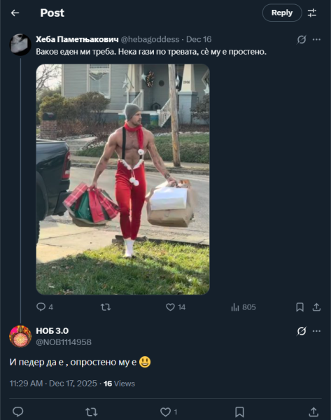 На ден 16.12.2025 година, Х корисникот „@hebagoddess“, на својот Х профил, објави слика од човек кој носи ќеси со одредени продукти, облечен во модифицирани алишта на Дедо Мраз. Во прилог на објавената слика, напиша: „Ваков еден ми треба. Нека гази по тревата, сѐ му е простено.“. Во коментар, под објавата, Х корисникот „@NOB1114958“ напиша: „И педер да е , опростено му е“. Со ваквиот коментар, корисникот користи говор на омраза насочен кон припадниците на геј заедницата.