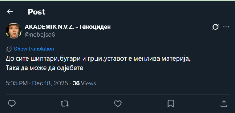 На ден 18.12.2025 година, Х корисникот „@nebojsa6“, на својот Х профил, напиша: „До сите шиптари,бугари и грци,уставот е менлива материја, Така да може да одјебете.“ Со ваквата објава, корисникот користи говор на омраза насочен кон албанскот население.