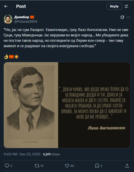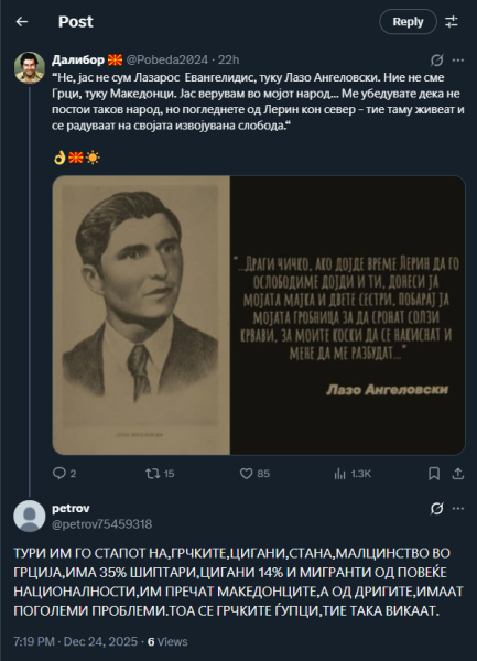 На ден 23.12.2025 година, Х корисникот „@Pobeda2024“, на својот Х профил, објави слика со цитат од Лазо Ангеловски, член на македонското национално движење во Грција во периодот на грчката граѓанска војна (1946-1949). Во прилог на објавата, напиша: „Не, јас не сум Лазарос Евангелидис, туку Лазо Ангеловски. Ние не сме Грци, туку Македонци. Јас верувам во мојот народ… Ме убедувате дека не постои таков народ, но погледнете од Лерин кон север - тие таму живеат и се радуваат на својата извојувана слобода.“ Во коментар, под објавата, Х корисникот „@petrov75459318“ коментира: „ТУРИ ИМ ГО СТАПОТ НА,ГРЧКИТЕ,ЦИГАНИ, СТАНАА МАЛЦИНСТВО ВО ГРЦИЈА, ИМА 35% ШИПТАРИ, ЦИГАНИ 14% И МИГРАНТИ ОД ПОВЕЌЕ НАЦИОНАЛНОСТИ, ИМ ПРЕЧАТ МАКЕДОНЦИТЕ, А ОД ДРИГИТЕ ИМААТ ПОГОЛЕМИ ПРОБЛЕМИ. ТОА СЕ ГРЧКИТЕ ЃУПЦИ, ТИЕ ТАКА ВИКААТ.“ Со ваквиот коментар, корисникот користи говор на омраза насочен кон грчкиот народ, кон албанското население, како и кон припадниците на ромската етничка заедница.
