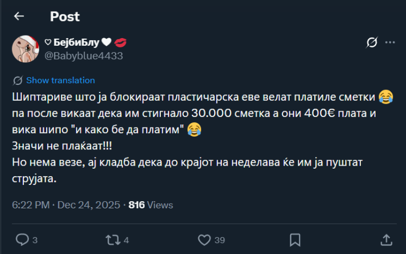 На ден 24.12.2025 година, Х корисникот „@Babyblue4433“, на својот Х профил, напиша: „Шиптариве што ја блокираат пластичарска еве велат платиле сметки, па после викаат дека им стигнало 30.000 сметка а они 400€ плата и вика шипо "и како бе да платим". Значи не плаќаат!!! Но нема везе, ај кладба дека до крајот на неделава ќе им ја пуштат струјата.“ Со ваквата објава, корисникот користи говор на омраза насочен кон албанското население.