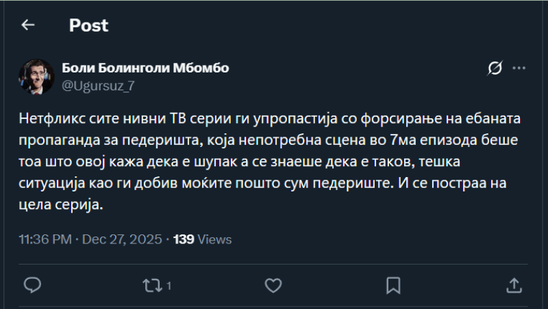 На ден 27.12.2025 година, Х корисникот „@Ugursuz_7“, на својот Х профил, напиша: „Нетфликс сите нивни ТВ серии ги упропастија со форсирање на ебаната пропаганда за педеришта, која непотребна сцена во 7ма епизода беше тоа што овој кажа дека е шупак а се знаеше дека е таков, тешка ситуација као ги добив моќите пошто сум педериште. И се постраа на цела серија.“. Со ваквата објаава, корисникот користи говор на омраза насочен кон припадниците на геј заедницата.