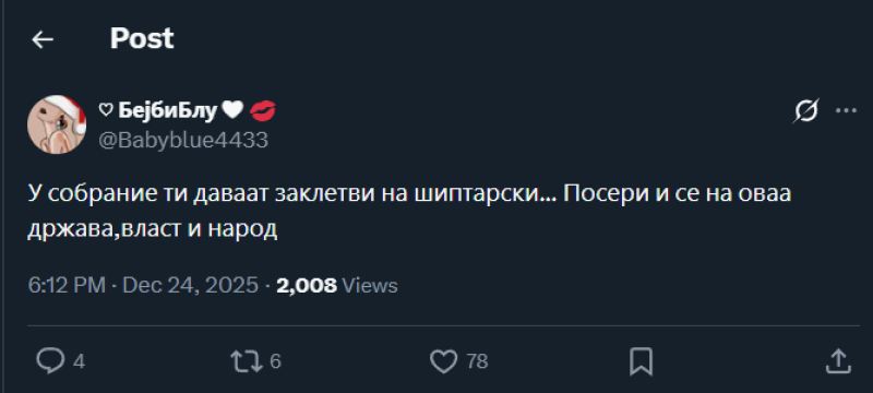 На ден 24.12.2025 година, Х корисникот „ @Babyblue4433“, на својот Х профил, напиша: „ У собрание ти даваат заклетви на шиптарски... Посери и се на оваа држава,власт и народ“. Со ваквата објава, корисникот користи говор на омраза насочен кон албанското население.