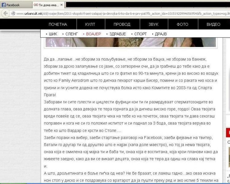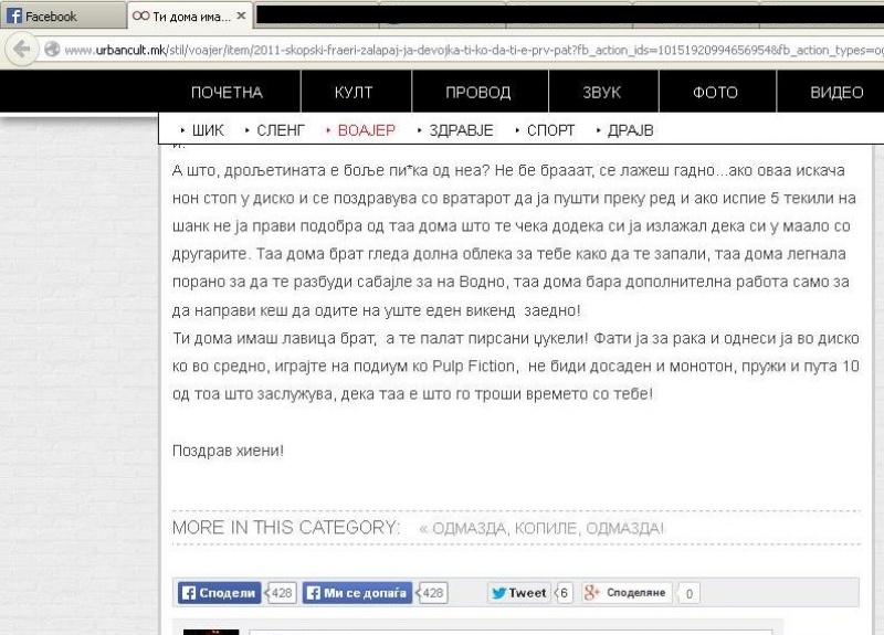 На сајтот urbancult.mk се појави статија со наслов „Ти дома имаш лавица брат, а те палат пирсани џукели!“, во кој авторот користи погрдни зборови кон жените, и воопшто говор кој го објективизира женското тело и ги повторува стереотипите кои веќе постојат.