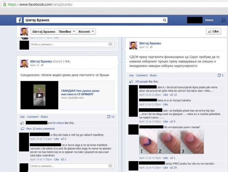 На фејсбук страната Шетај Бранко е забележан говор на омраза врз основа на политичка припадност поради објава на известувања за изборни нерегуларности во текот на гласањето во првиот претседателски круг - претседателски избори 2014